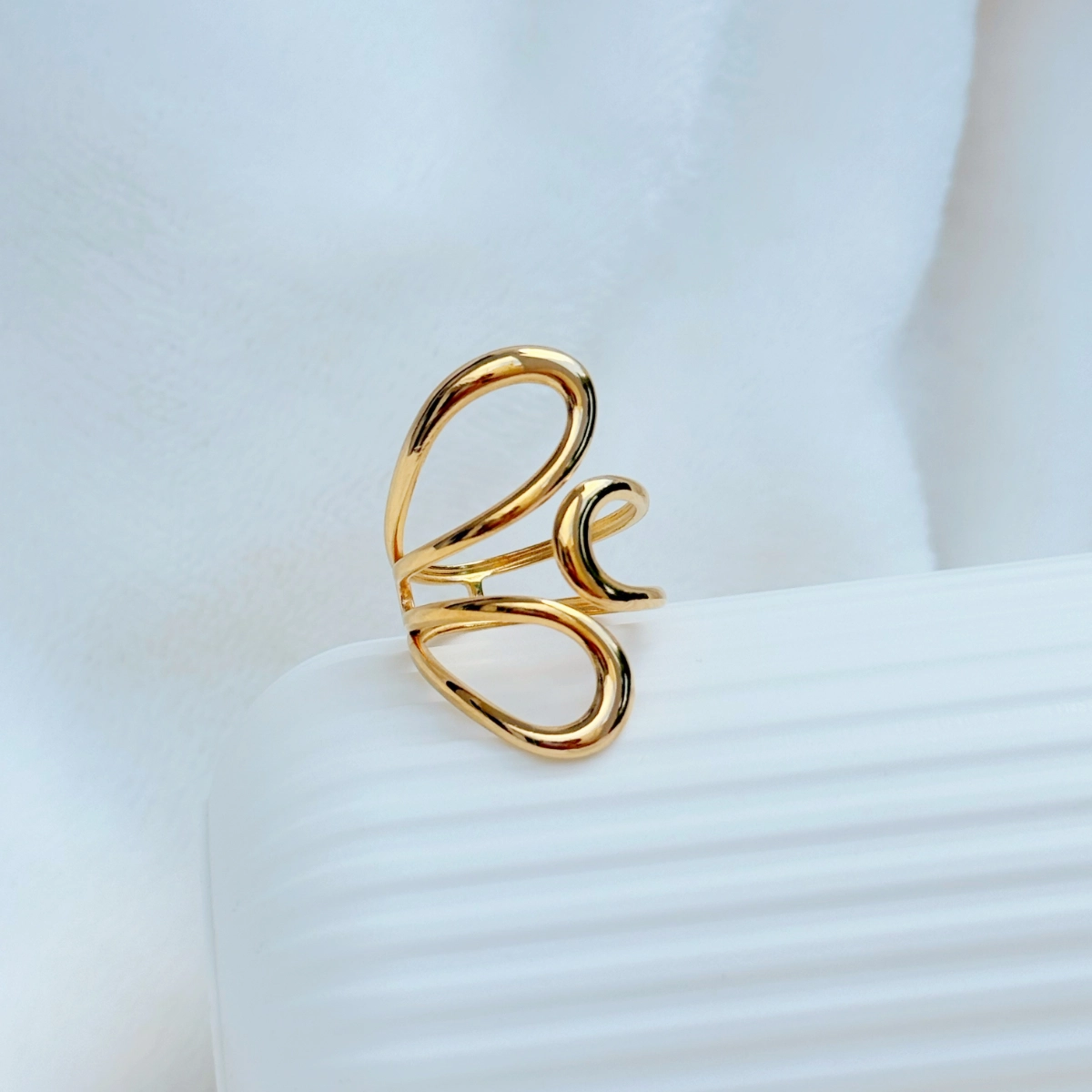 El Anillo Aria es una pieza moderna y artística que destaca por sus líneas fluidas y delicadas. Su diseño abierto crea un efecto orgánico y elegante, inspirado en los trazos suaves que representan movimiento, libertad y feminidad.