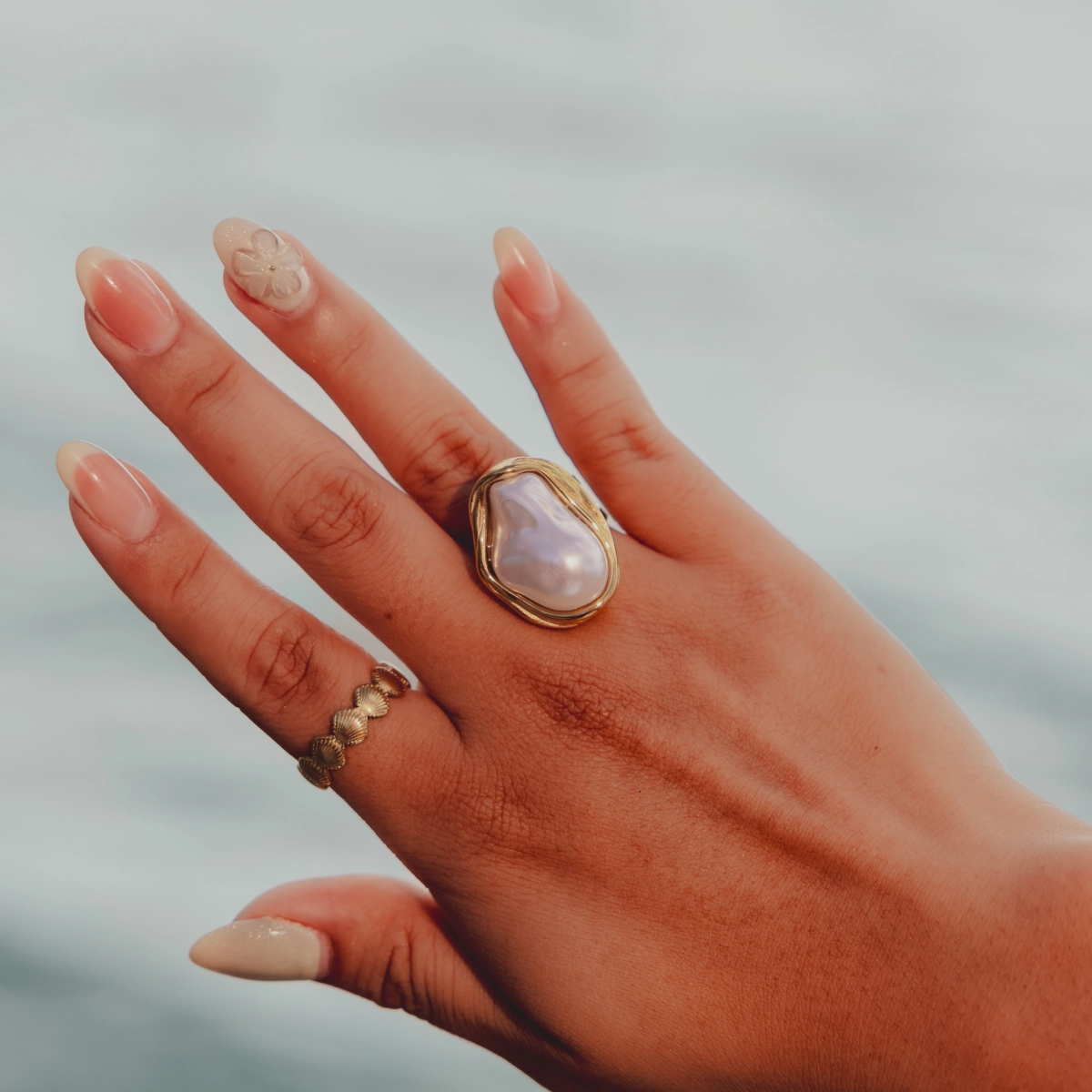 El Anillo Brisa es una pieza sofisticada que combina la suavidad de la perla con un diseño orgánico envolvente. Su forma fluida y elegante imita el movimiento ligero del viento sobre el mar, creando un accesorio lleno de armonía y presencia.