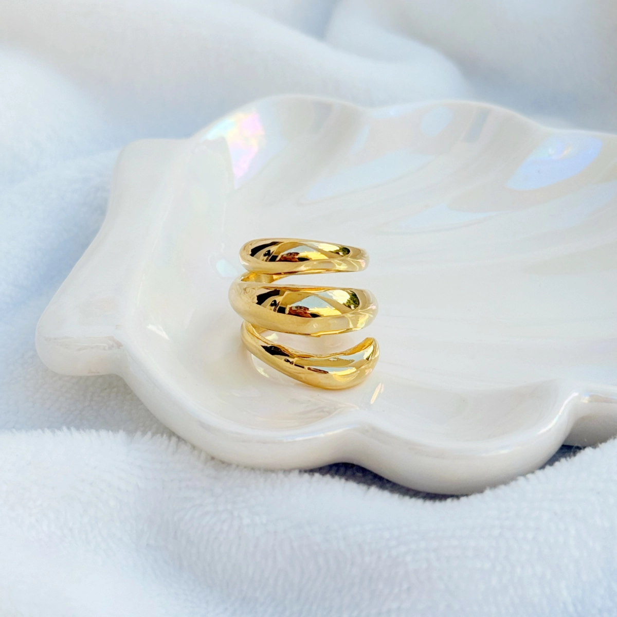 El Anillo Cosmo es una pieza moderna y envolvente que destaca por su diseño de volumen suave y acabado ultra brillante.