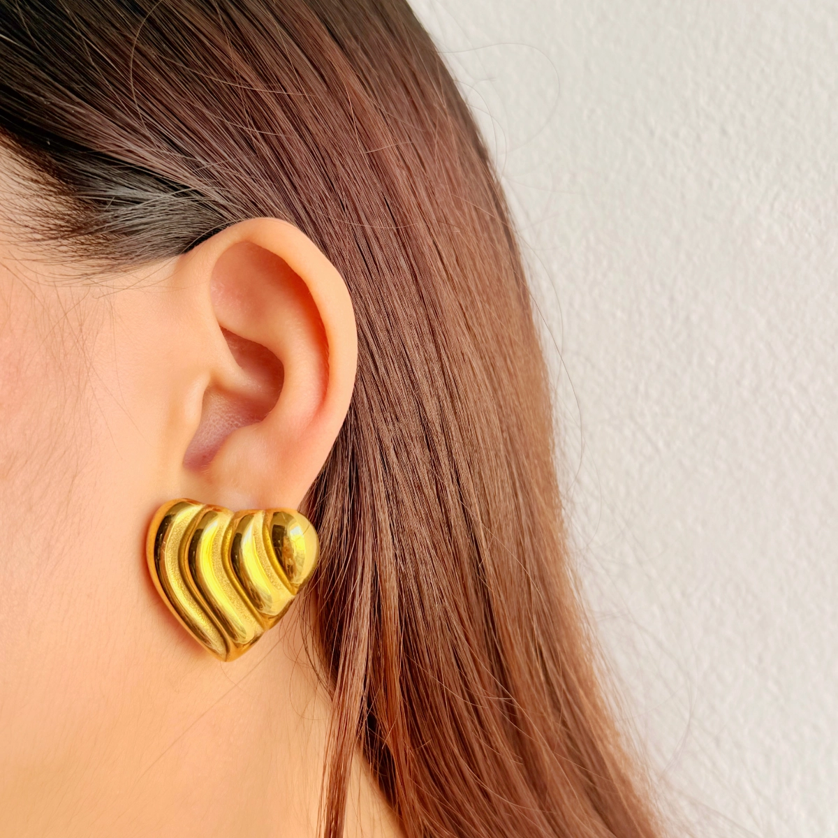 Los Aretes Cupido destacan por su diseño voluminoso y curvado, formado por varias ondas suaves que se superponen entre sí, creando un efecto tridimensional muy llamativo. Su acabado pulido da un brillo espejo que resalta al instante, mientras su forma redondeada aporta un toque romántico y moderno a la vez.