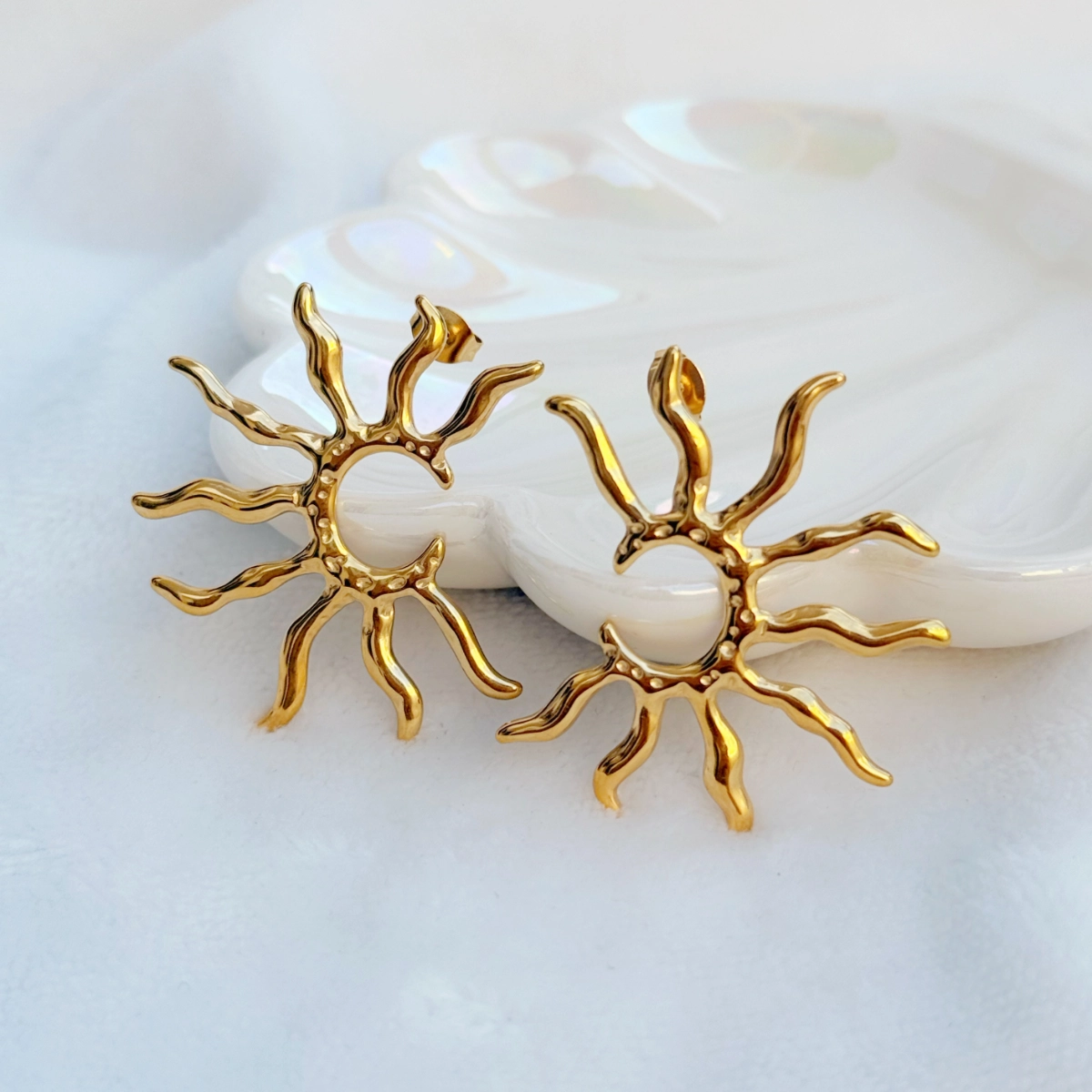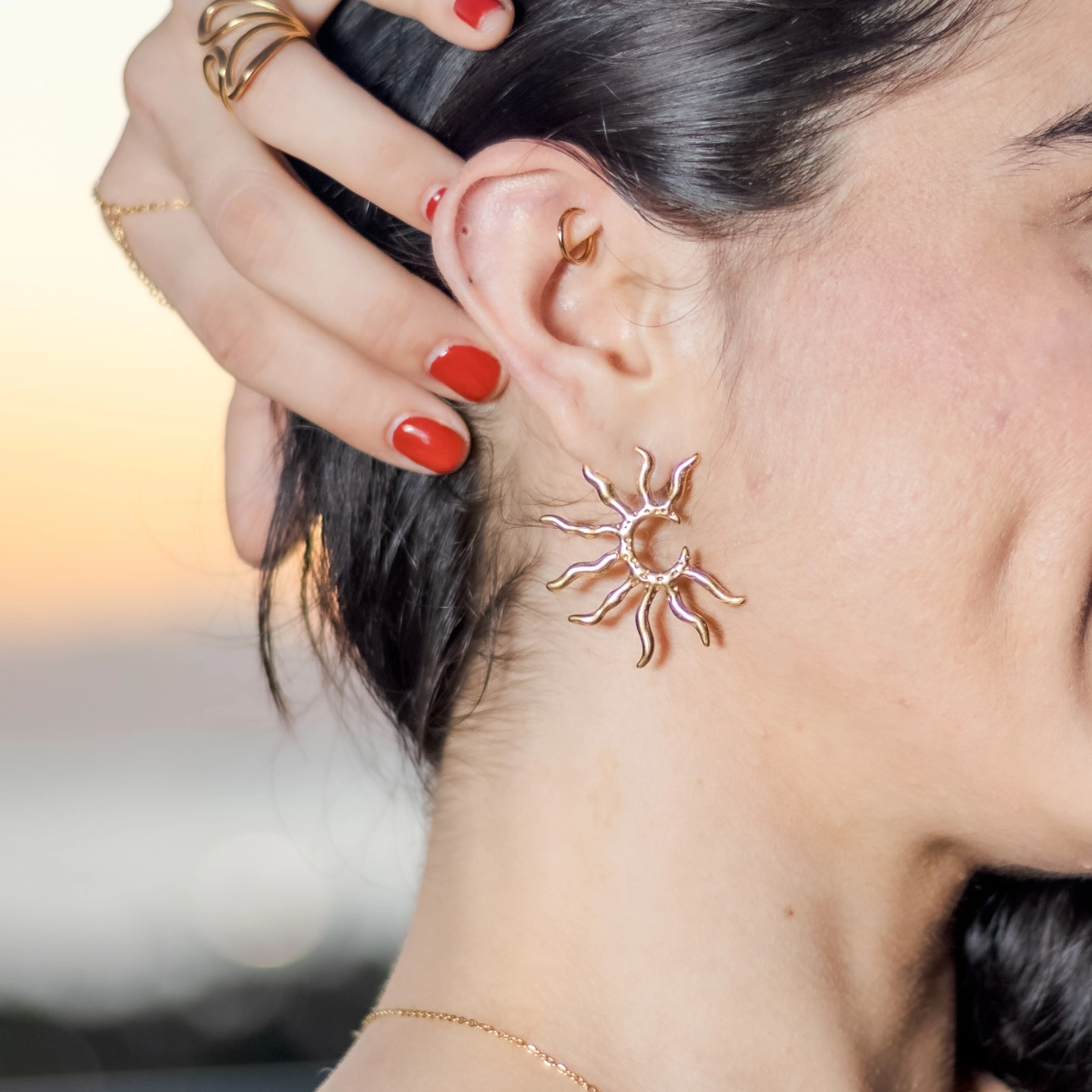 Aretes Rayos de Sol están elaborados en acero inoxidable diseñados con un acabado orgánico que representa la fuerza, energía y calidez del sol.