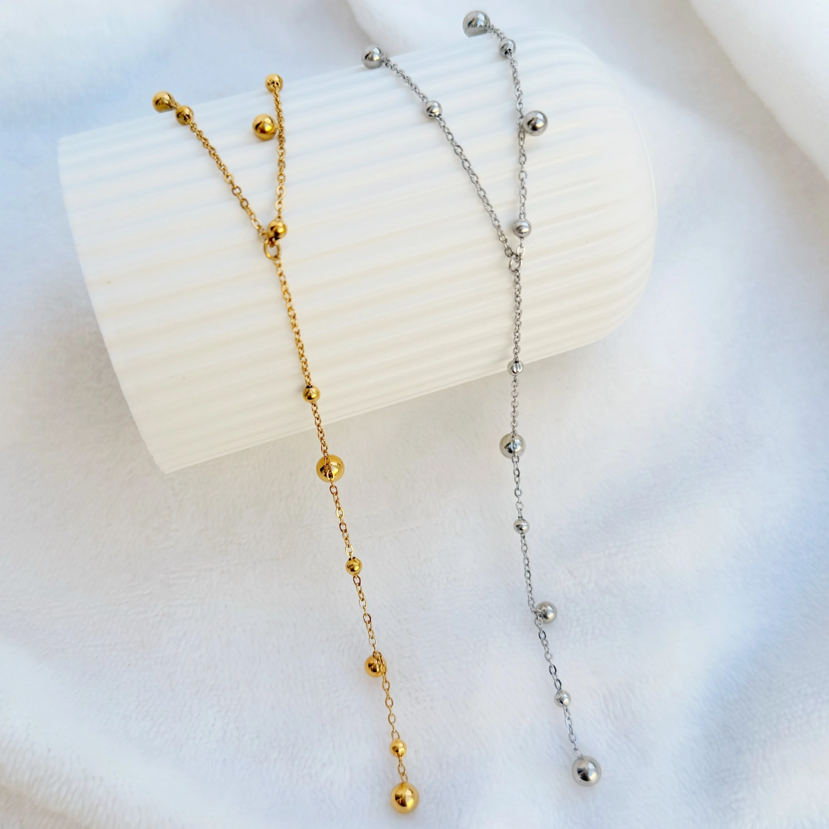 El Collar Celine destaca por sus delicadas esferas distribuidas a lo largo de la cadena, creando un movimiento sutil y lleno de brillo.