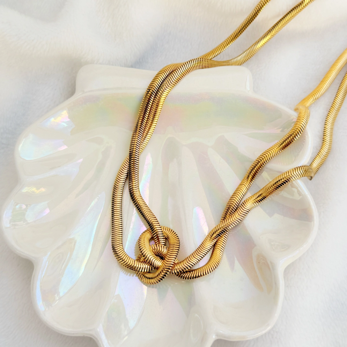 El Collar eterno es una pieza moderna y llena de carácter, para acompañarte siempre sin perder su brillo. Su diseño tipo serpiente con un nudo elegante al centro simboliza unión, fuerza.