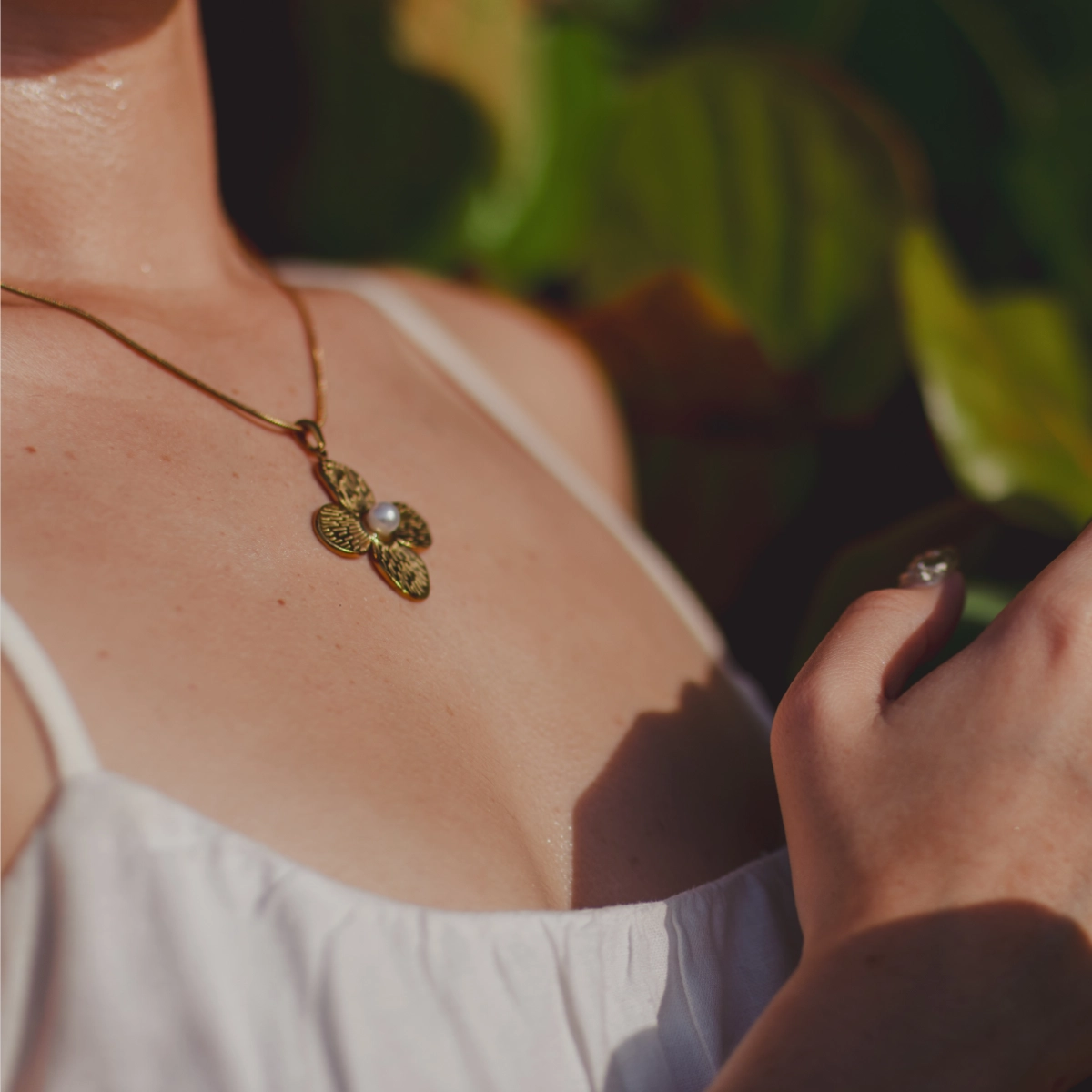 Un diseño delicado y femenino que destaca por su dije en forma de flor de cuatro pétalos con textura metálica y una perla acrílica central que aporta un toque elegante.