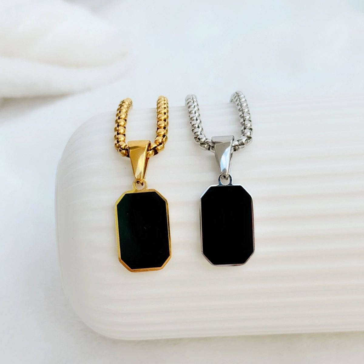 El Collar Nocturno está diseñado para quienes aman la elegancia minimalista con un toque de misterio. Su dije rectangular de acabado brillante y cadena gruesa le dan una presencia moderna y poderosa.