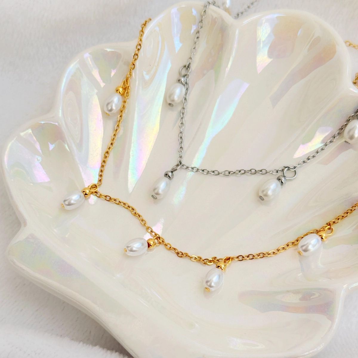 El Collar Perlitas es una pieza delicada y luminosa que captura la esencia del mar en cada detalle. incorpora pequeñas perlas artificiales que cuelgan suavemente, creando un movimiento sutil y elegante en el cuello.