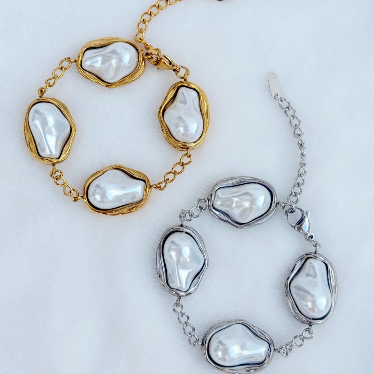 La Pulsera Brisa está inspirada en la suavidad del mar y en el movimiento delicado del viento costero. Sus perlas irregulares, enmarcadas con detalles dorado o plateado, crean un diseño elegante y moderno.